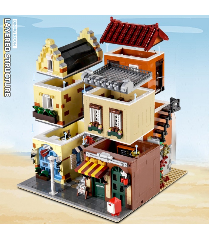 MOLD KING 16008 Diese Streetscape-Reihe von Cafés stellt das europäische urbane Straßenbild mit hoher Simulation wieder her. Die LED-Leuchten im Paket können ein Nachtlicht für Innenräume simulieren, was mehr Spielbarkeit ermöglicht.