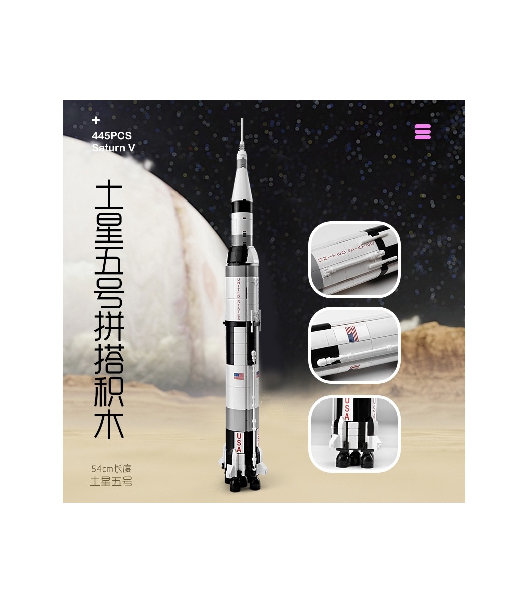 Eine Apollo Saturn V-Rakete, die die echte Trägerrakete im Weltraumprogramm der NASA hochgradig restaurierte. Dieses Raketenmodell kann in mehrere Teile geteilt werden und die Teile bestehen aus umweltfreundlichen und ungiftigen Materialien.