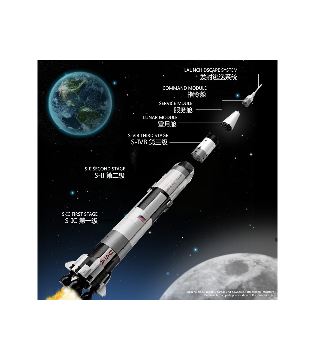 • Das Mondmodul, das Servicemodul und das Kommandomodul des Raketenmodells können zerlegt und zusammengebaut werden;