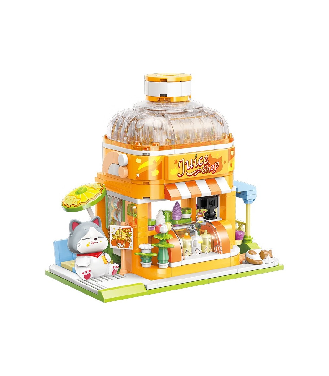 Blue and white cats have a simple appearance, a bold and curious personality, are friendly to people, and are easy to raise, making them one of the most commonly raised cats in families. This model is a juice shop. The model is equipped with a doll with a blue and white cat appearance, making it more distinctive. The model is divided into two layers, each containing rich details. The first layer of the model is equipped with menus, cash registers, etc., making the model more interesting. The second layer is equipped with various beverage accessories, making the model more attractive.