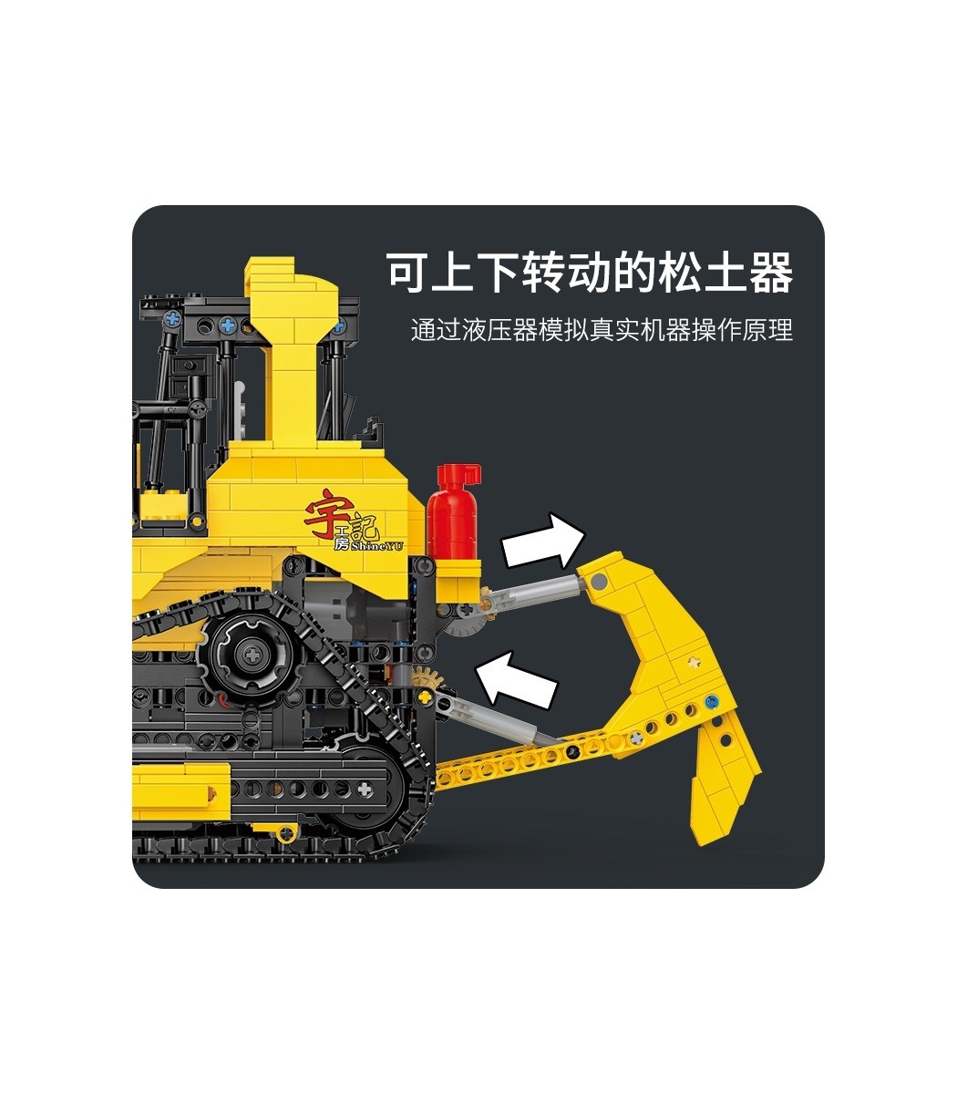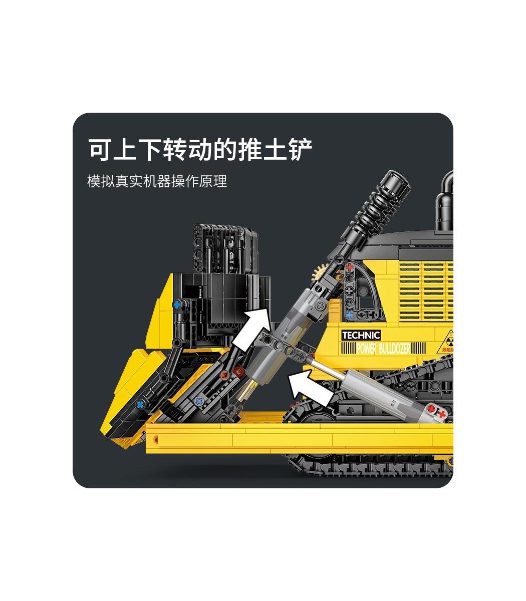 • This bulldozer building block can simulate the operating principle of the real machine, and the bulldozer blade can be rotated up and down; the operating principle of the real machine can be simulated by the hydraulic device, and the ripper can be rotated up and down;