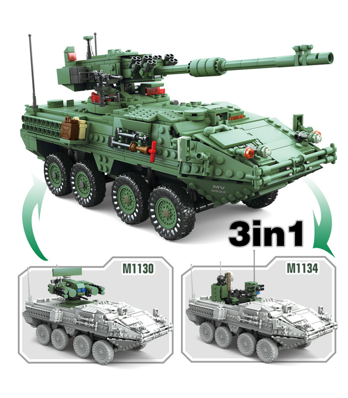 • Este edificio de juguete es un 3-en-1 de diseño, que pueden ser convertidos en M1128, M1130, M1134 Stryker serie de combate blindado vehículo.