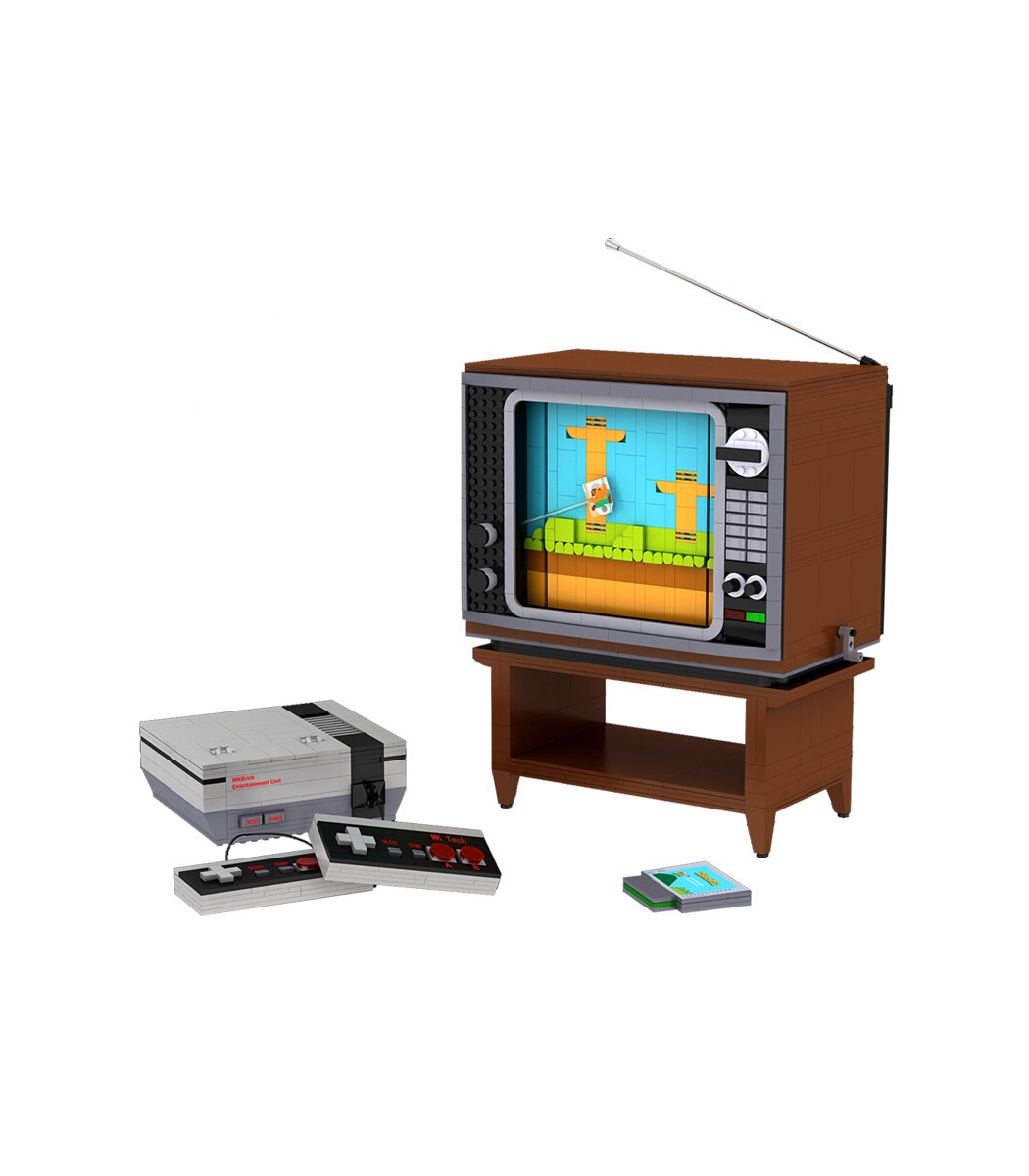 Este MOLD KING 10013 simula la consola de juegos de 8 bits de Nintendo, incluida la consola, el brazo y el televisor. Al girar la manija del televisor, los personajes del juego y las escenas en la pantalla se pueden mover. Este juego de juguetes de bloques de construcción reproduce perfectamente la consola de juegos retro y el televisor, que es muy adecuado para los fanáticos de los videojuegos.
