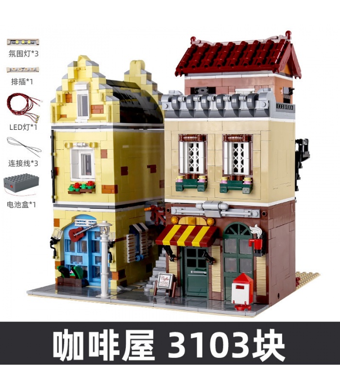 MOLD KING 16008 Esta serie de cafés de paisaje urbano restaura el paisaje urbano europeo con alta simulación. Las luces LED en el paquete pueden simular una luz nocturna interior, lo que permite una mayor jugabilidad.