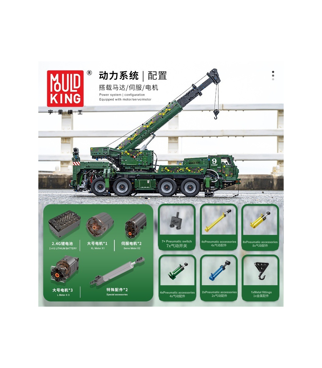 • Este kit de construcción de grúas sobre orugas viene con accesorios de alimentación asociados que incluyen: motor grande, motor extra grande, servomotor, batería de litio y accesorios relacionados.