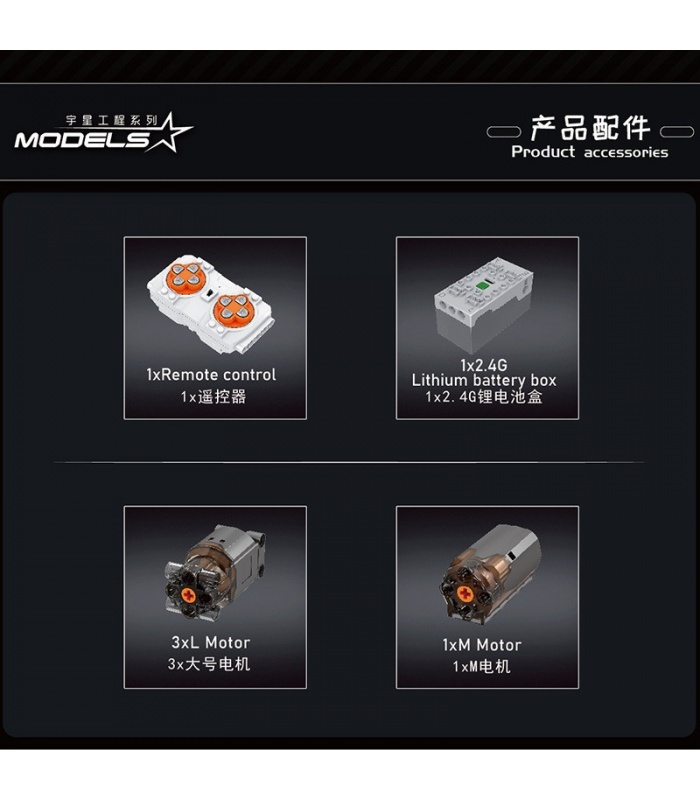 • Los accesorios de alimentación pertinentes se entregan en el conjunto de construcción, incluido el servomotor, el motor de potencia, la caja de batería de litio, el cable de datos y el control remoto.