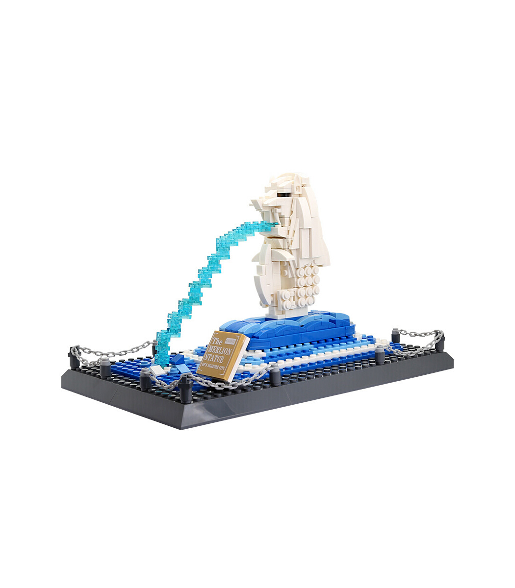 Merlion Una escultura de una cabeza de león, cuerpo del pez, y cola de pez. Tan alta como la de 8.4 metros, la parte superior de la cabeza de león es de 2,3 metros de largo, 1.7 metros de ancho, y pesa 40 toneladas. La escultura está ubicada en el Parque de Merlion, Singapur.