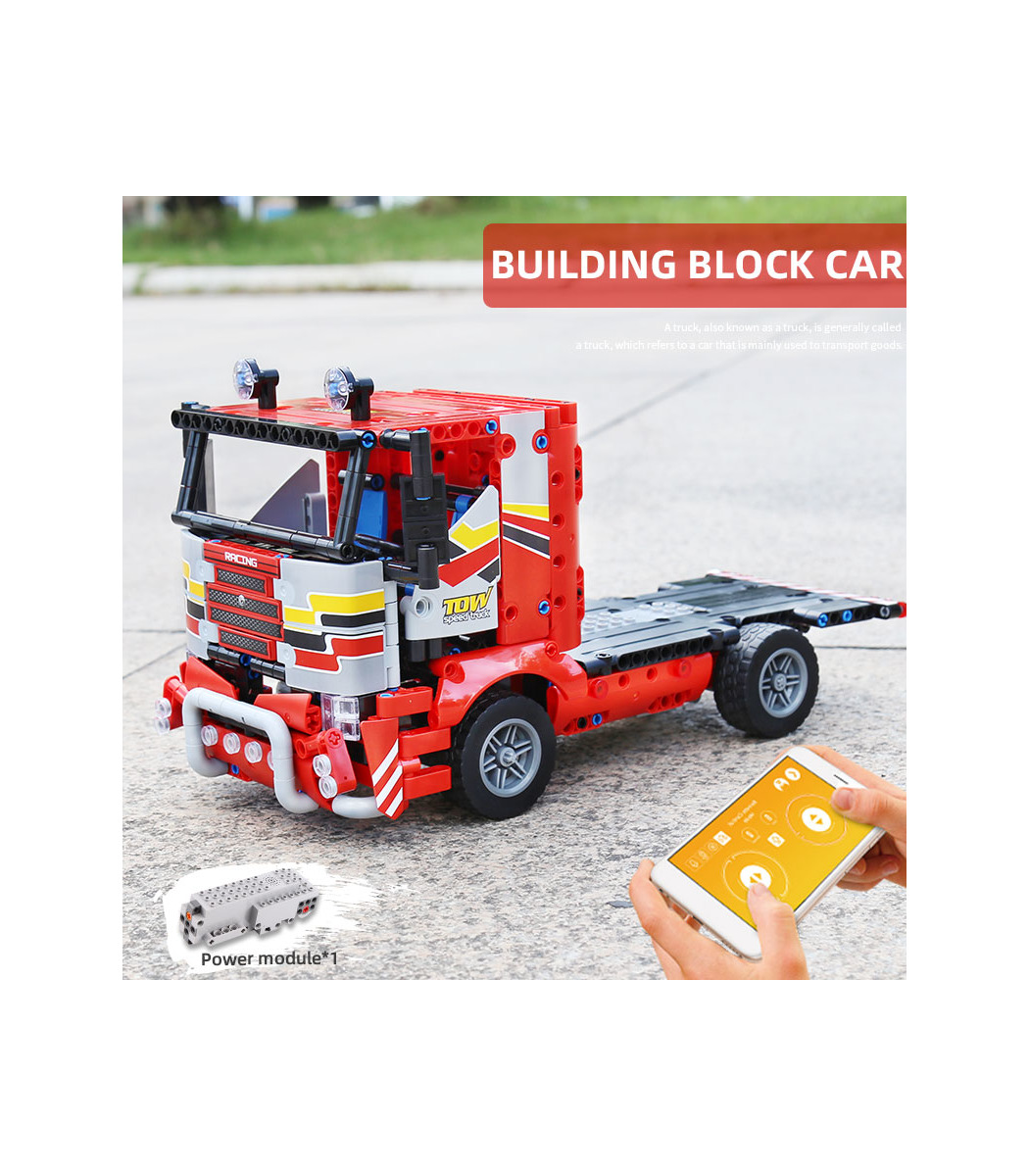 Les jouets de blocs de construction de camions de transport MOLD KING, grâce au module d'alimentation intégré, peuvent réaliser l'application pour téléphone portable et la télécommande de deux manières pour contrôler le camion.