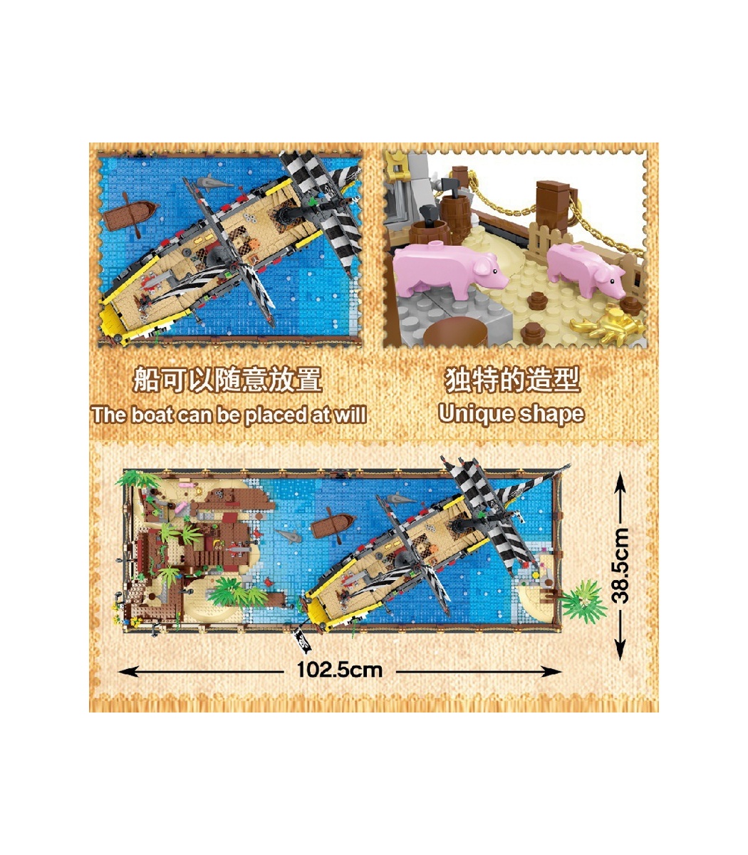 Le modèle de bloc de construction Booty Bay 031002 de MORK est composé d'une base et d'un bateau. Les animaux sur le bateau ont des formes uniques et le module marin du socle est composé de 5 couleurs.