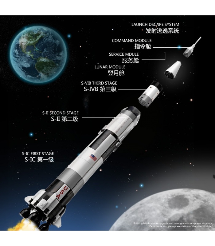 • Le module lunaire, le module de service et le module de commande du modèle de fusée peuvent être démontés et assemblés ;
