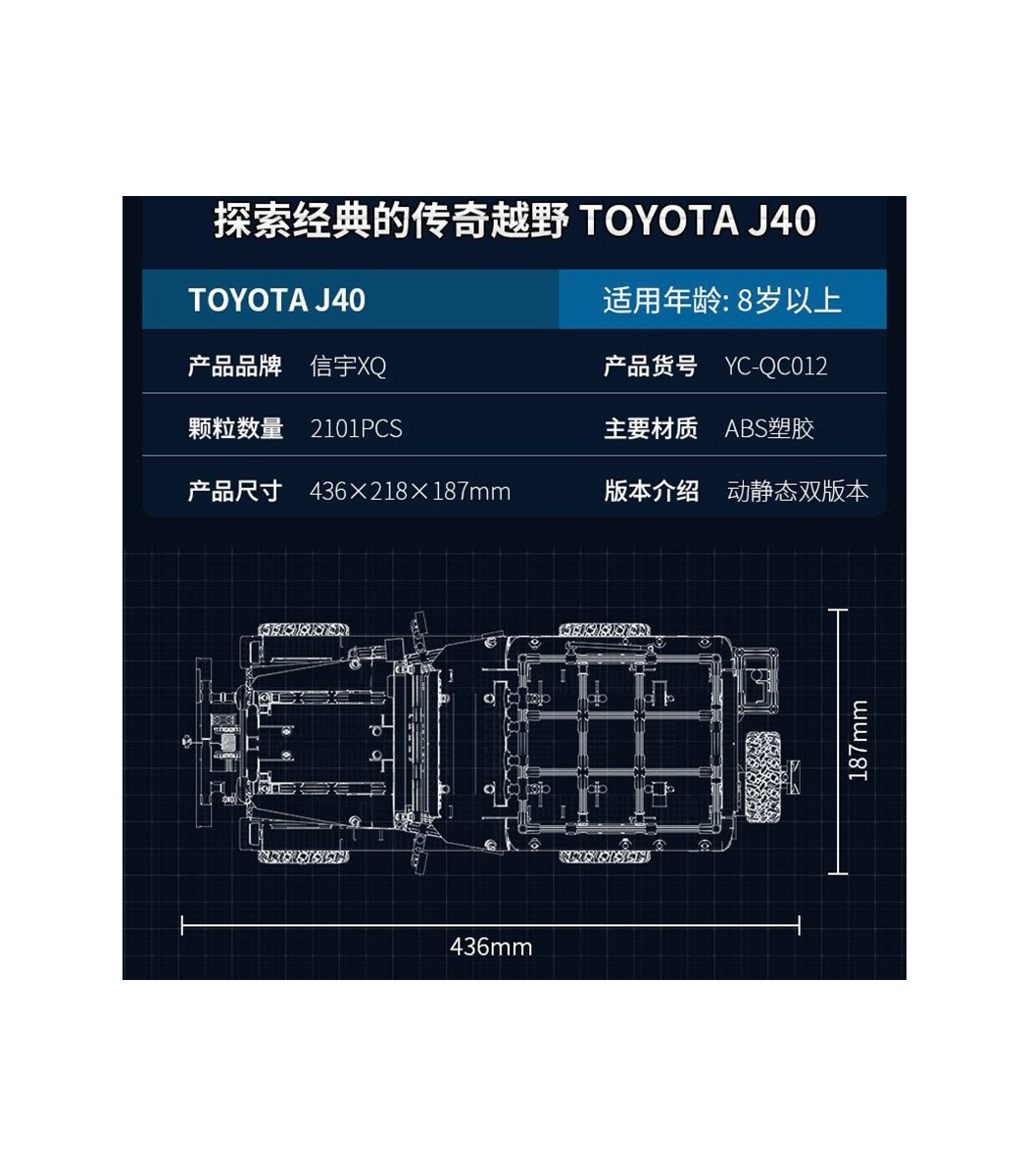 Toyota FJ40 오프로드 차량의 이 기술 시리즈는 실제 자동차의 구조적 특성을 복원하는 1:12 대규모 높은 시뮬레이션에 따라 전체 빌딩 블록 건설 스포츠카이며 바디 라인이 매끄럽고 상쾌하고 밝은 파란색 외관, 실제 자동차의 외관을 고도로 복원했습니다.
